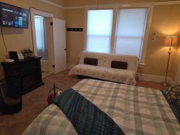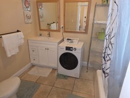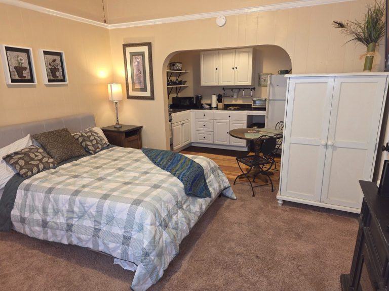 Perfect for solo travelers or couples in search of a cozy getaway, our professionally designed petite 2nd floor studio apartment is a small (380+ feet) but comfortable and convenient space. The open layout effortlessly connects the living, dining, and sleeping areas, where you'll discover a queen-sized bed, a small dining table, and a fully equipped kitchenette with all the essentials." Unique to this small space is a large walk-in closet with desk and comfortable desk chair. In addition, the bathroom is equipped with a small factor washer/dryer for your convenience.